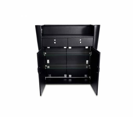 Ontvangst van hoge kwaliteit. Meubels gemaakt van MDF, bekleed met brandvertragend zwart PVC-kunstleer. Schuifladen op geleiders (met slot en sleutel). Bergruimte achterin met twee deuren. Display voor producten aan de voorkant met 3 planken verlicht door neonlicht. Stopcontact en schakelaar aan de bovenkant van de kast.